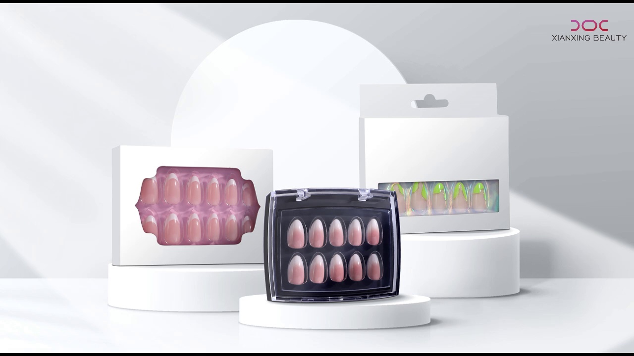 Diverse Packaging Options: As seen in the video, Xianxing Beauty provides diverse packaging options for their press-on nails, including plastic blister packs in various shapes and configurations, as well as elegant paper boxes, both with dimensions suitable for retail display and easy storage. The packaging is designed to protect the nails and showcase their beauty, enhancing the overall appeal of the product.